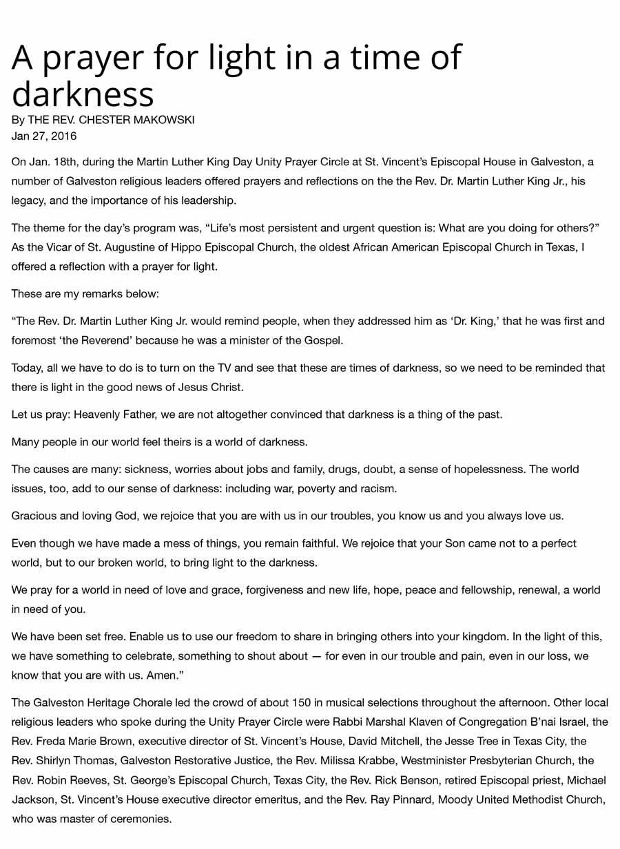 January 18, 2016: Galveston Heritage Chorale Leads Music At MLK Day Unity Prayer Circle Galveston Daily News Guest Opinion Galveston Daily News