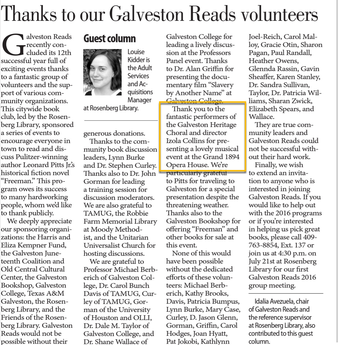 July 9, 2015: Galveston Heritage Chorale Supports Rosenberg Library’s “Galveston Reads” Program