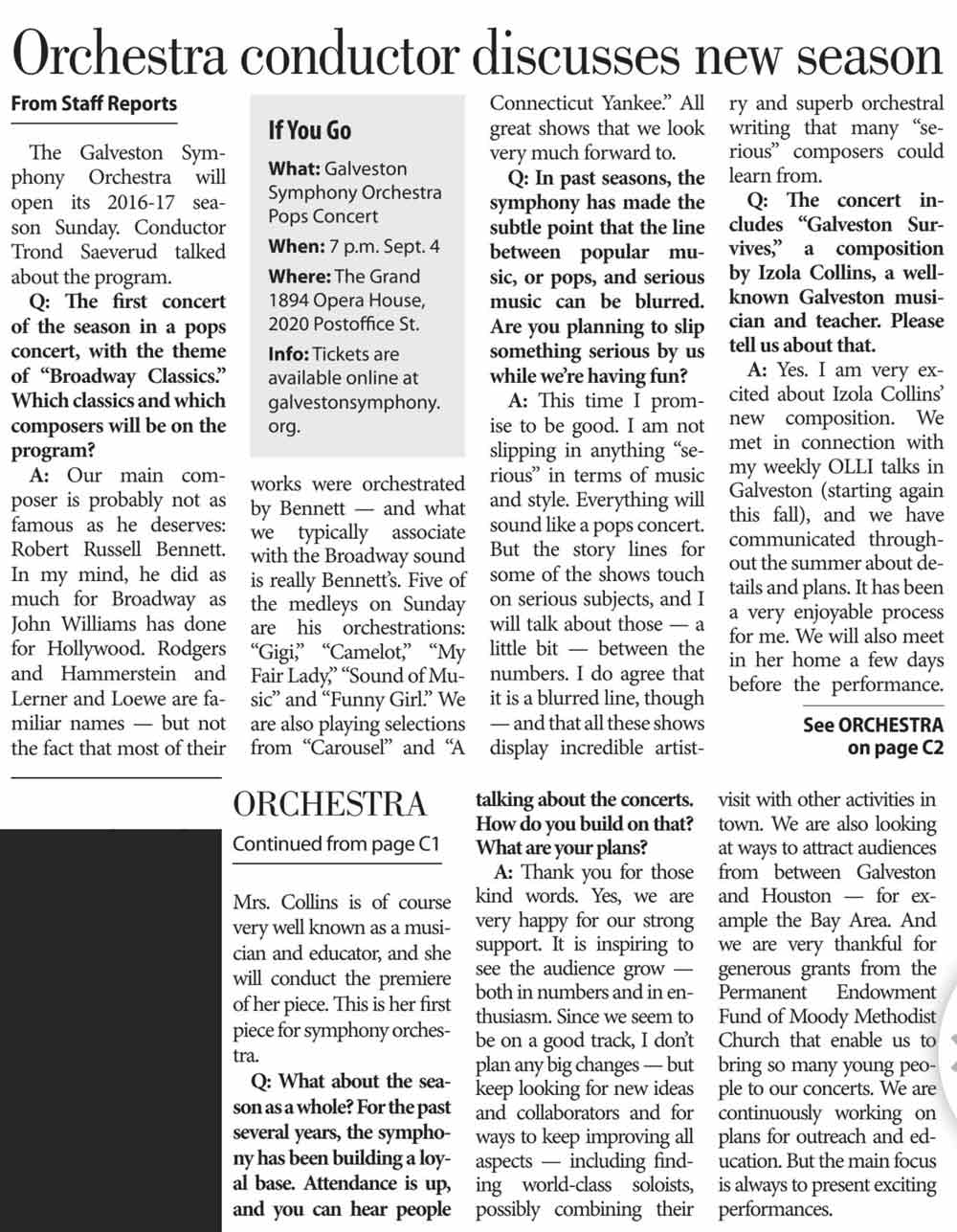 September 22, 2016: Mrs. Izola Collins’ “Galveston Survives” To Be Part of Galveston Symphony Orchestra